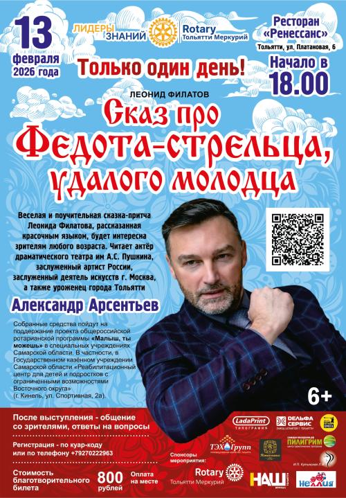 Благотворительный театральный вечер Ротари клуба Тольятти Меркурий, Клубный проект «Лидеры знаний Ротари» 13 февраля 2026 года, начало в 18-00.