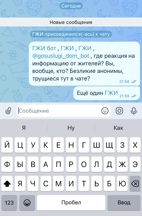 Поводом для беспокойства послужило наличие в чате отдельно взятого дома сразу 3 одинаковых аккаунтов «ГЖИ» без фото. Идентифицировать их как-либо невозможно, о связи с Госжилинспекцией Самарской области не свидетельствует ровным счётом ничего. Более того, крайне сомнительно, что в ГЖИ в Самаре трудоустроено столько людей, что на отдельно взятый 128-квартирный дом нашлось сразу 3 «куратора».